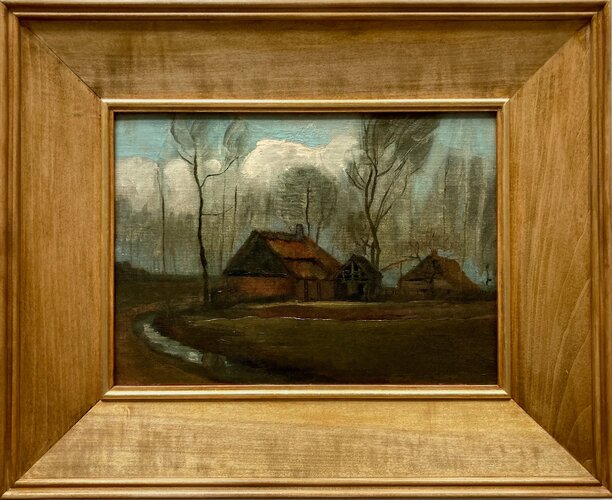Artysta namalował „Wiejskie chaty pośród drzew” w 1883 roku, czyli mniej więcej 5 lat przed swoimi najsłynniejszymi dziełami, takimi jak „Słoneczniki” czy „Pokój w Arles”. Po opuszczeniu przez artystę Nuenen obraz znalazł się wśród innych jego dzieł, które zostały zapakowane przez jego matkę do skrzyń i na wiele lat zapomniane. Przechowywane na strychu domu stolarza Adrianusa Schrauwena, uznawane były za obiekty bezwartościowe. Dopiero w 1902 roku Johannes Cornelis Couvreur odkupił zawartość strychu za symboliczną sumę i próbował sprzedawać płótna z wózka domokrążcy, a niektóre z nich rozdawał w zamian za piwo (Miłosz Kargol, kurator Galerii Sztuki Europejskiej MNK; na podstawie katalogu wystawy: „Van Gogh. Historie jednego obrazu” (2024), kwerenda: Juliette van Uhm).